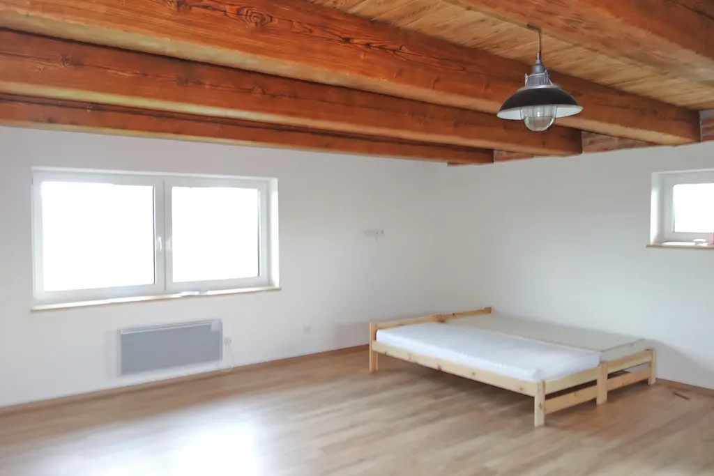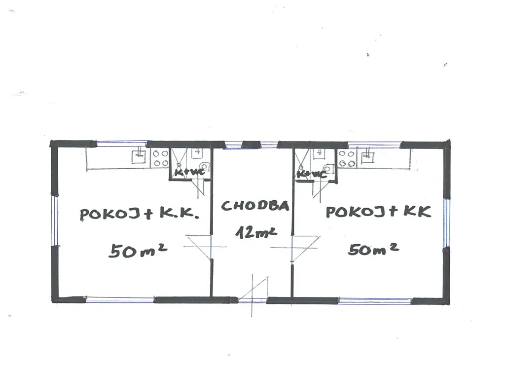 Dispozice domu je navržena jako dvougenerační s dvěma bytovými jednotkami 1+kk (každá s koupelnou s WC).V případě potřeby možno přepříčkovat na obvyklejší dispozici např.3+kk,4+kk