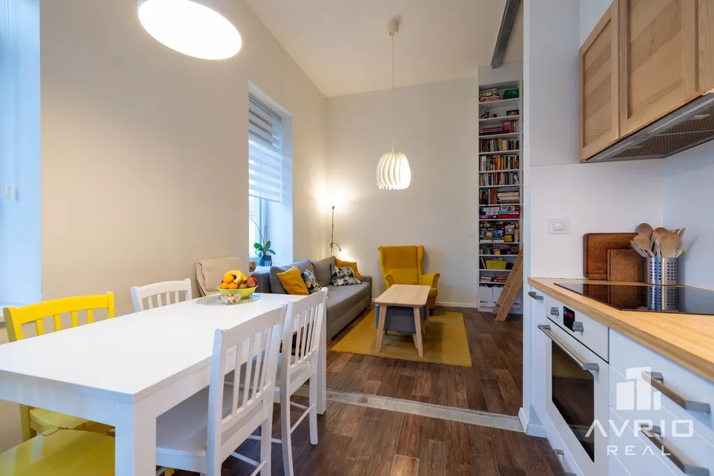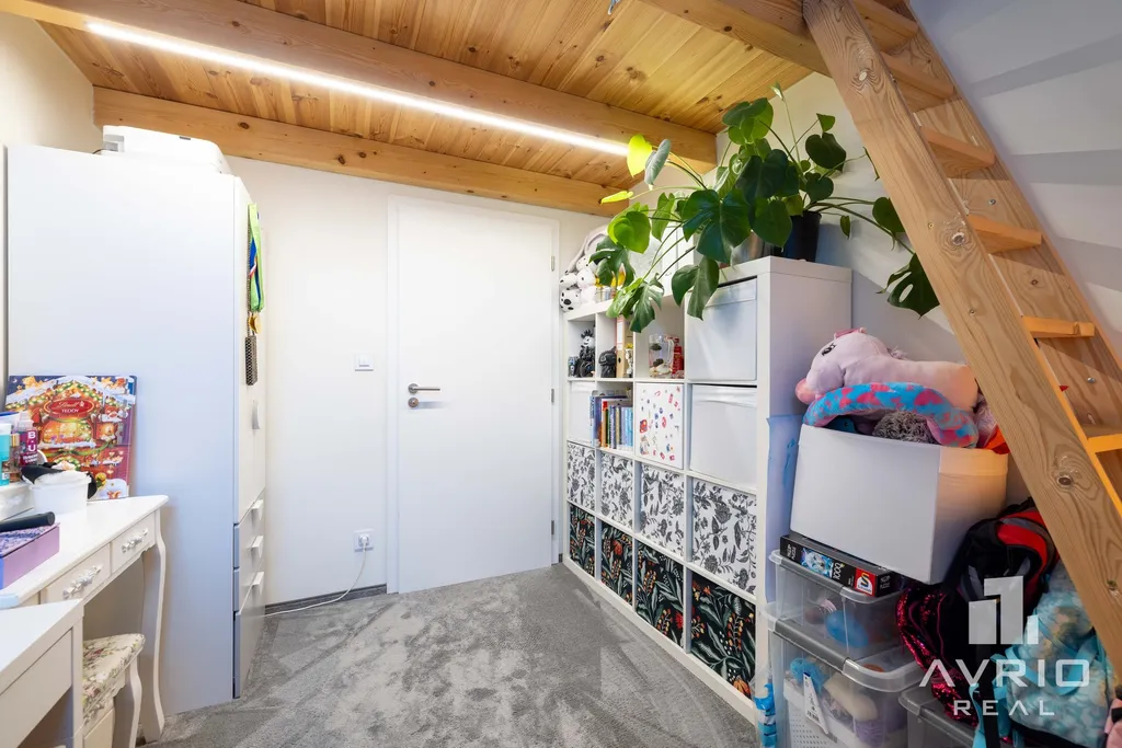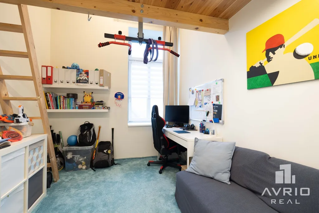 Byt prošel v roce 2021 další změnou, během které došlo k změně původní dispozice na 3+kk. Vysoké stropy v obývací a kuchyňské části dávají příjemný pocit vzdušnosti a světlosti bytu. V dalších obytných místnostech daly vysoké stropy možnost vybudovat spací či odpočinkové galerie, které výrazně rozšiřují užitný prostor bytu. Na vizualizaci pokoje je pak vidět možné umístění manželské postele.