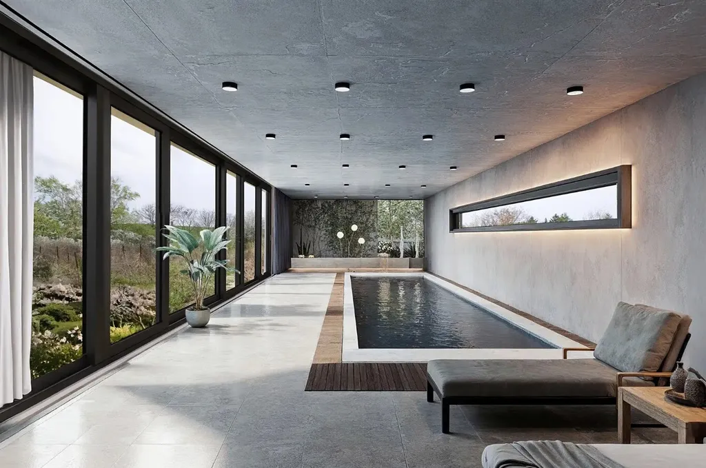 Součástí této části je příprava pro vnitřní bazén, relaxační zónu se saunou, technické místnosti, dvě koupelny, dvě obytné místnosti a hlavní obytný prostor s velkoformátovým portálem, který se může vizuálně otevřít přes dvě podlaží. V pravé části domu navazuje garáž pro čtyři vozidla s přímým vstupem.