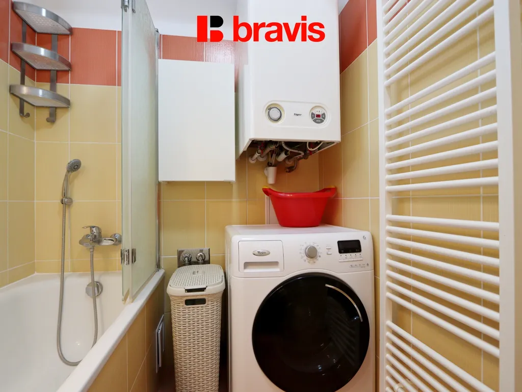 V koupelně je vana, umyvadlo, pračka a plynový kotel.