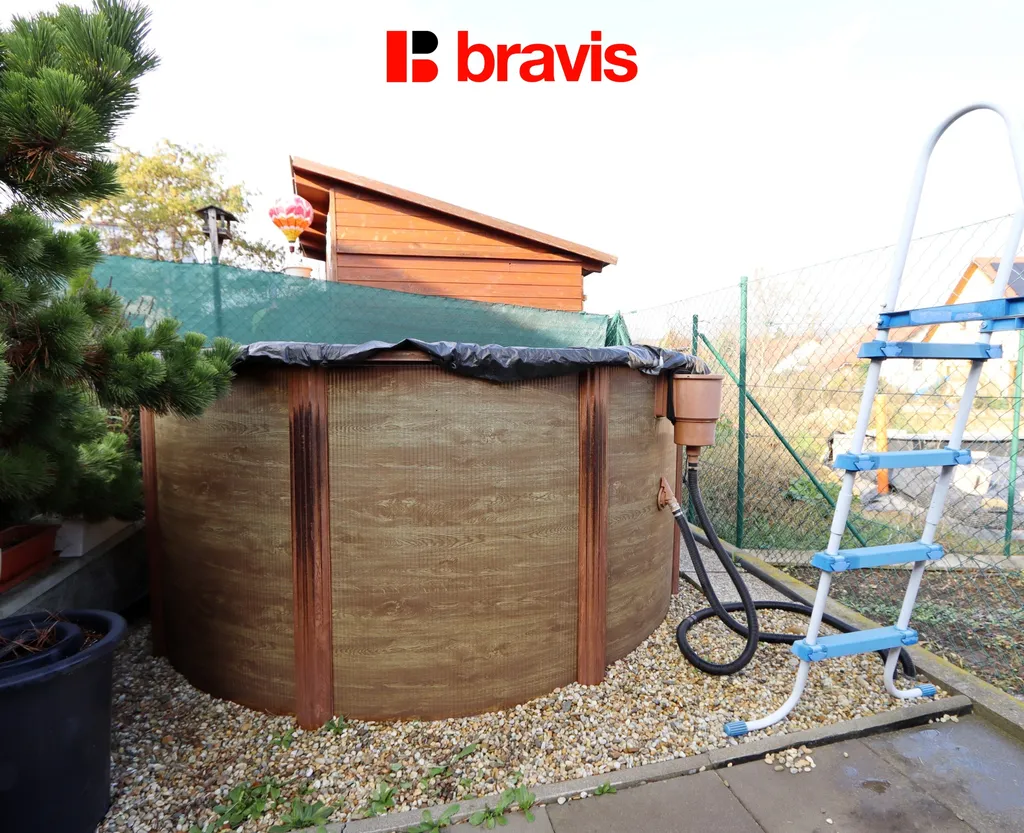 Velkou výhodou je zahrádka za domem, kde se nachází venkovní posezení pod pergolou, zahradní domek a menší bazén.
