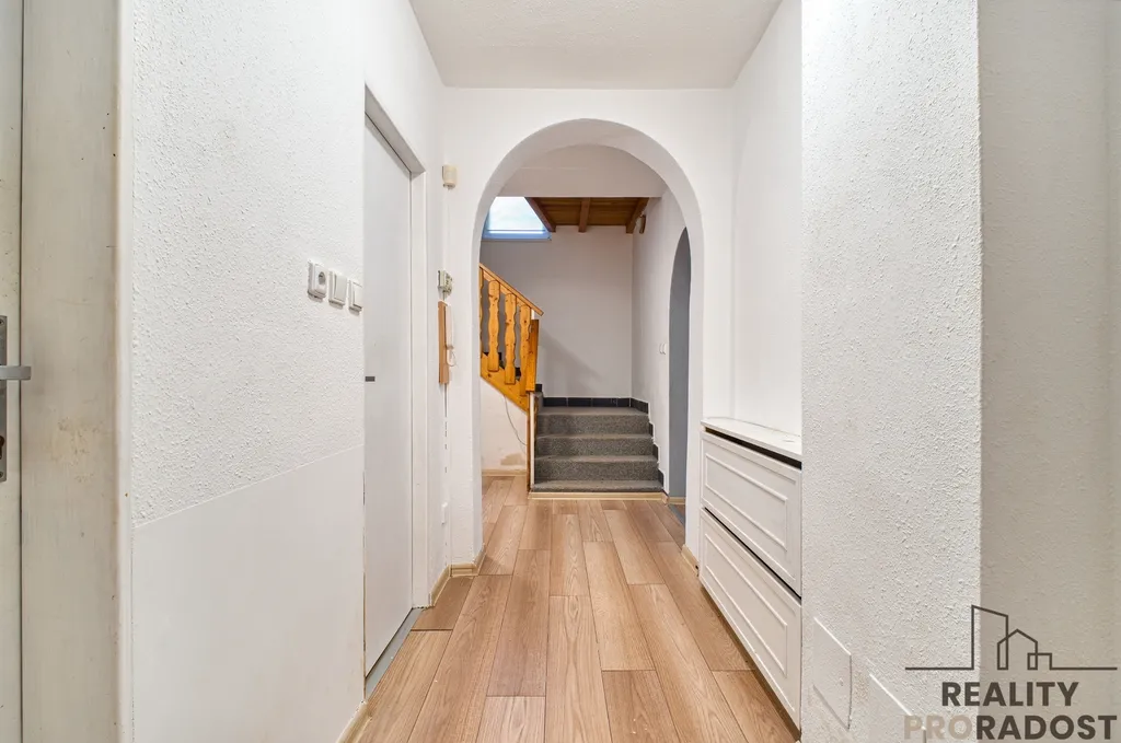 Prodej dvoupodlažního bytu, který je řešen jako krajní řadový dům s vlastní zahradou. Jednotka o dispozici 4+1 se 2 balkóny, komorou, vlastní garáží a zahradou o velikosti 1026 m2 se nachází na konci slepé ulice v Prostřední Suché. Z jednotky lze vystoupit na vlastní nesdílenou oplocenou zahradu, která nabízí maximální soukromí. Na zahradu se vstupuje z obývacího pokoje, nachází se zde zastřešení s posezením, kotec pro psy, zahradní domek. Posezení je oploceno gabiony a betonovým plotem pro naprosté soukromí a klid.