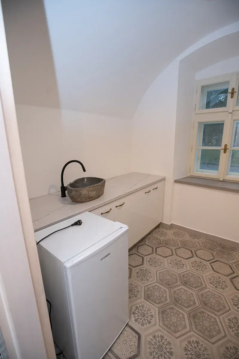 Malebný dům i okolí. Strategické místo v centru. Levné parkování (zóna F), v blízkosti parkovací dům Rychtářka. Napojeno na pult centrální ochrany. Nízké náklady, topení - tepelné čerpadlo. Rekonstrukce právě dokončena, jedná se o první pronájem.