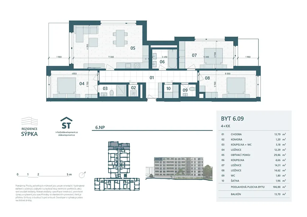 Byt má podlahovou plochu 106,9 m2 a dva balkony o celkové výměře 13,7 m2. Dominantou je světlý obývací pokoj s kuchyňským koutem o téměř 30 m2. Dispozice nabízí tři samostatné ložnice, dvě koupelny, samostatné WC, šatnu a komoru, což zajišťuje komfortní rodinné bydlení.
