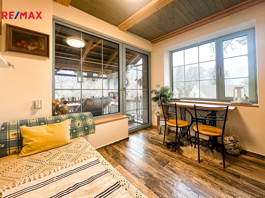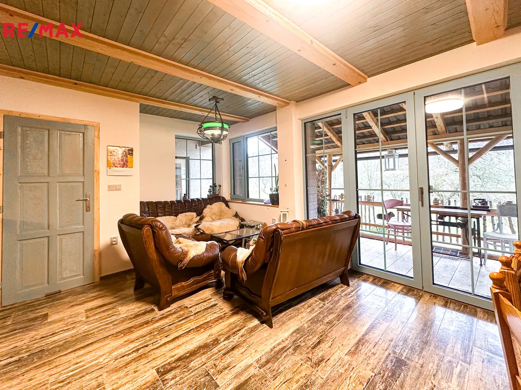 Další místnost s prosklenou stěnou je za kuchyní, a i zde je přímý vstup na terasu. Dále je zde druhá koupelna se sprchovým koutem a WC.
