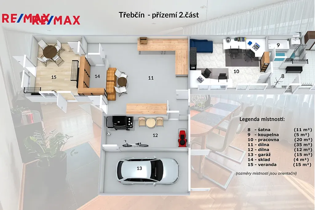 V exkluzivním zastoupení majitele nabízíme k prodeji dům se zahradou v Třebčíně nedaleko Olomouce. Vícepodlažní dům s půdou je částečně podsklepený s garáží, dílnou a skladovými prostory. Vytápění je ústřední s plynovým kotlem umístěným v suterénu a dále je provedena příprava pro krbová kamna. Dům je napojen na veřejnou kanalizaci, vodovod, plyn a elektřinu. V domě jsou plastová okna, laminátové podlahy a sádrokartonové podhledy. V 1. NP se nachází obývací pokoj s jídelnou, kuchyně, koupelna (vana, sprcha, umyvadlo, WC), vstupní hala, WC, prádelna. V přístavbě 1. NP se nachází pracovna, předsíň, šatna, koupelna (není dokončena, příprava pro sprchu, umyvadlo a WC). V této přístavbě lze řešit samostatnou obytnou jednotku nebo prostor pro podnikání. Ve 2.NP se nachází 3x ložnice, koupelna (sprcha, umyvadlo), skladový prostor s možným užitím jako šatna. Půda je svojí rozlohou a charakteristikou určená k případné půdní vestavbě.