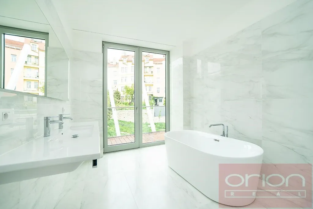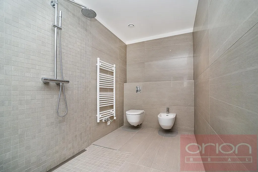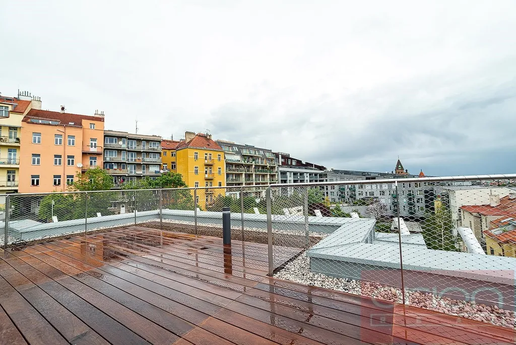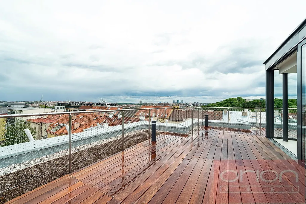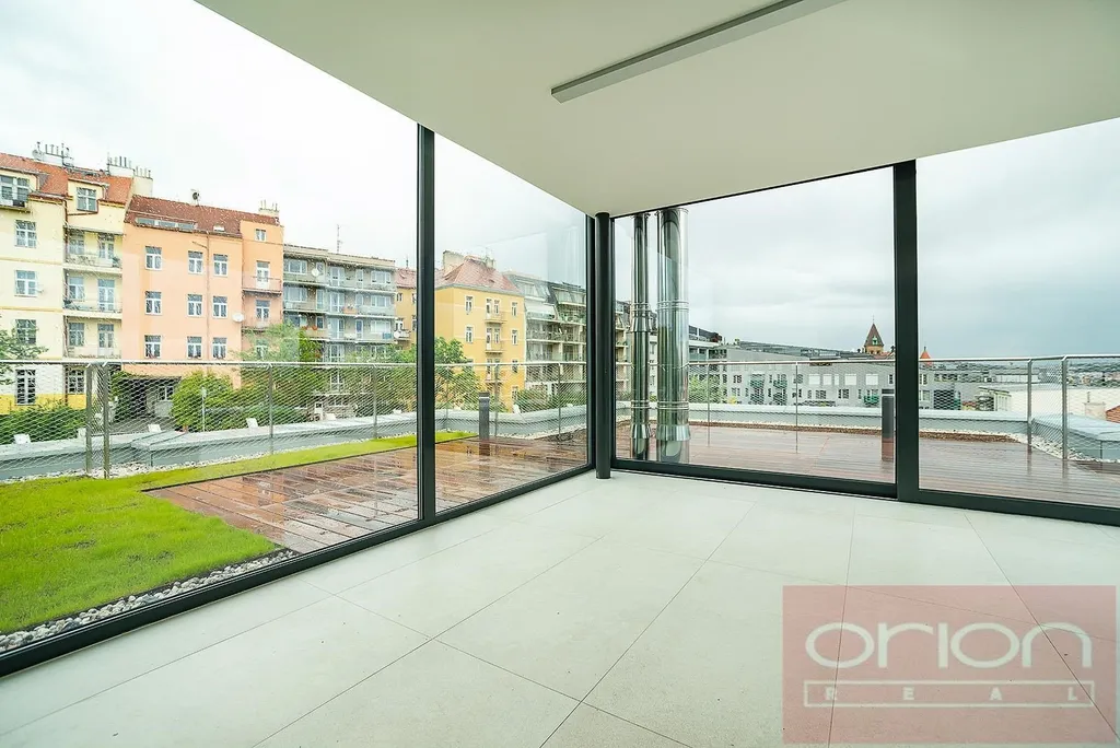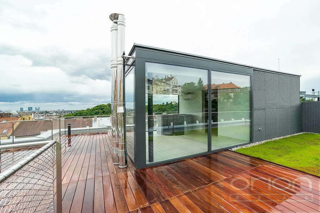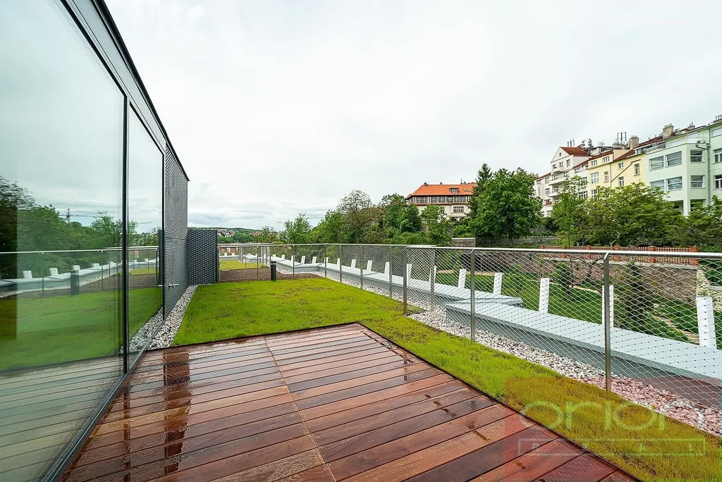 Nabízíme k pronájmu luxusní mezonetový byt 4+kk se třemi terasami a vlastní zahradou v 6. patře exkluzivního bytového komplexu Rezidence Ellipsis s recepcí, výtahem, podzemní garáží, wellness - bazén, sauna, a rozlehlou zahradou s parkovou úpravou ve vyhledávané lokalitě Praha 5 – Smíchov. Nezařízený byt s celkovou obytnou plochou 211,7 m2 nabízí v nižším patře halu, prostorný obývací pokoj s krbem spojený s jídelnou a plně vybavenou kuchyní a se vstupem na terasu s krásným výhledem, 3 ložnice se vstupem na terasu, 2 koupelny s vanou, sprchou, toaletou, bidetem (jedna koupelna je přístupná z ložnice), samostatnou toaletu, chodbu a prádelnu. V horním je patře je otevřená galerie (možná 4. ložnice) s privátním wellness se saunou, koupelna a vstup na střešní terasu se zahradou (31 m2). Součástí vybavení bytu jsou kvalitní dubové podlahy, velkoformátová dlažba, francouzská okna, bezpečnostní dveře, internet, klimatizace, pračka, sušička. K bytu náleží sklep. Nájem 5.400 EUR splatný v eurech + poplatky 150 Kč/m2 bytu + 21% DPH + extra členský poplatek 2.500 CZK/os/měsíc za využívání Wellness s vnitřním bazénem a saunou přímo v bytovém projektu. Možnost nájmu garážové stání za poplatek 230 EUR + 21% DPH/měsíc. Oblíbená lokalita Praha 5 - Smíchov s výborným dopravním spojením, v pěší vzdálenosti na stanici metra a tramvaje Anděl, do nákupního centra Nový Smíchov, do Německé a Francouzské školy. Autem blízký nájezd na Pražský okruh a dálniční síť.