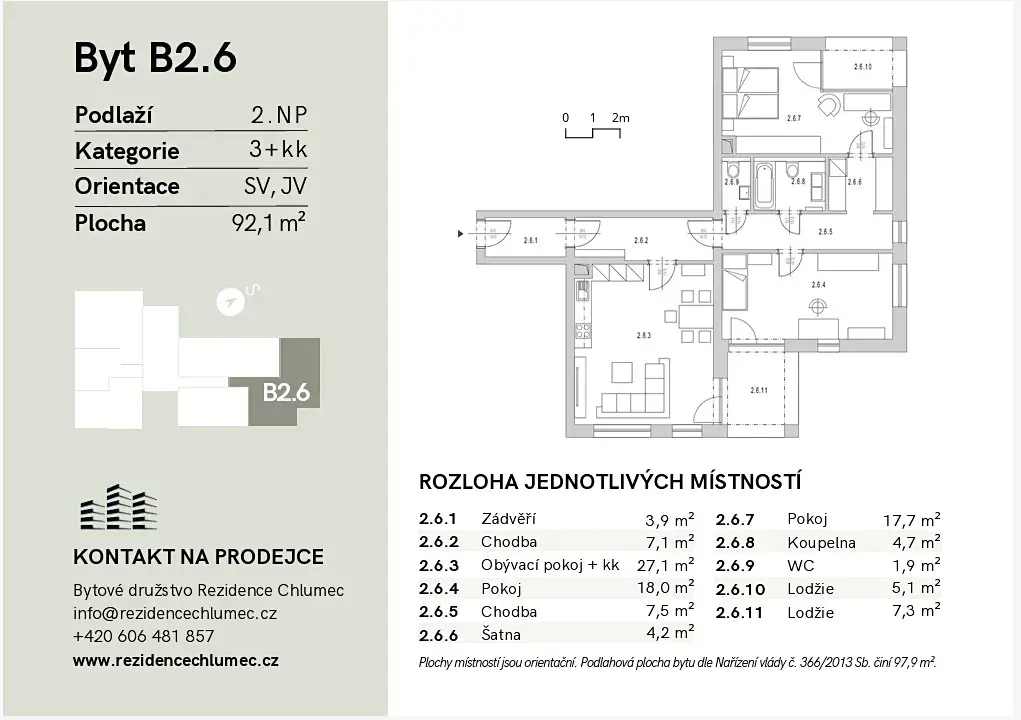 Nabízíme k prodeji byt č. 2.6 o velikosti 3+kk, 92,1 m2 + 2x lodžie o celkové velikosti 12,4 m2.