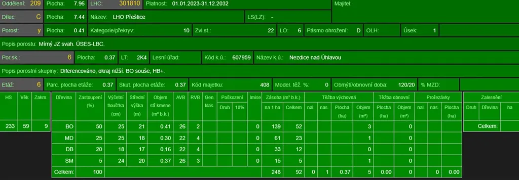 - p.č. 150/97 vedená jako lesní pozemek o celkové výměře 4 108 m2 (stáří lesa 61 let - zastoupení dřevin borovice, modřín, dub, smrk)