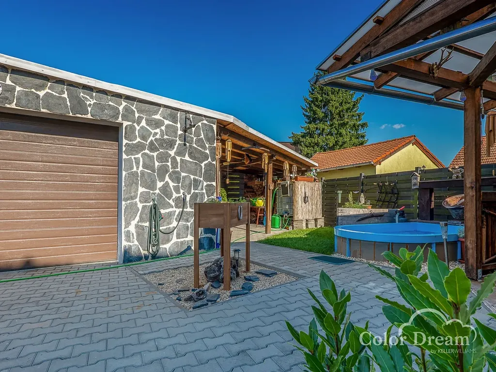 Ve dvoře je dřevěná pergola skvělá k relaxaci a venkovnímu posezení, bazén, v zadní části dvora je garáž (cca 30 m2). Na dvůr a do garáže je možný vjezd. Parkování je možné i na komunikaci před domem.