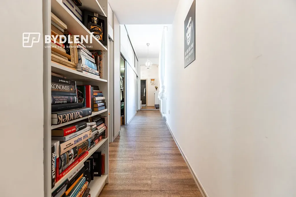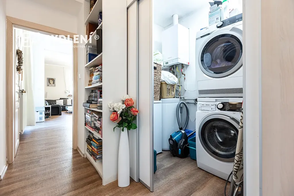 Designová koupelna s dvojicí umyvadel a moderním walk-in sprchovým koutem je oddělená od samostatného WC. Prostorná a okny prosvětlená vstupní hala má po celé délce samostatný uzavřený prostor, který nabízí nadstandardní úložné prostory a samostatnou část vyhrazenou pro technologické zázemí bytu, kde se nachází moderní kondenzační plynový kotel se zásobníkem na TUV a také pračka a sušička.