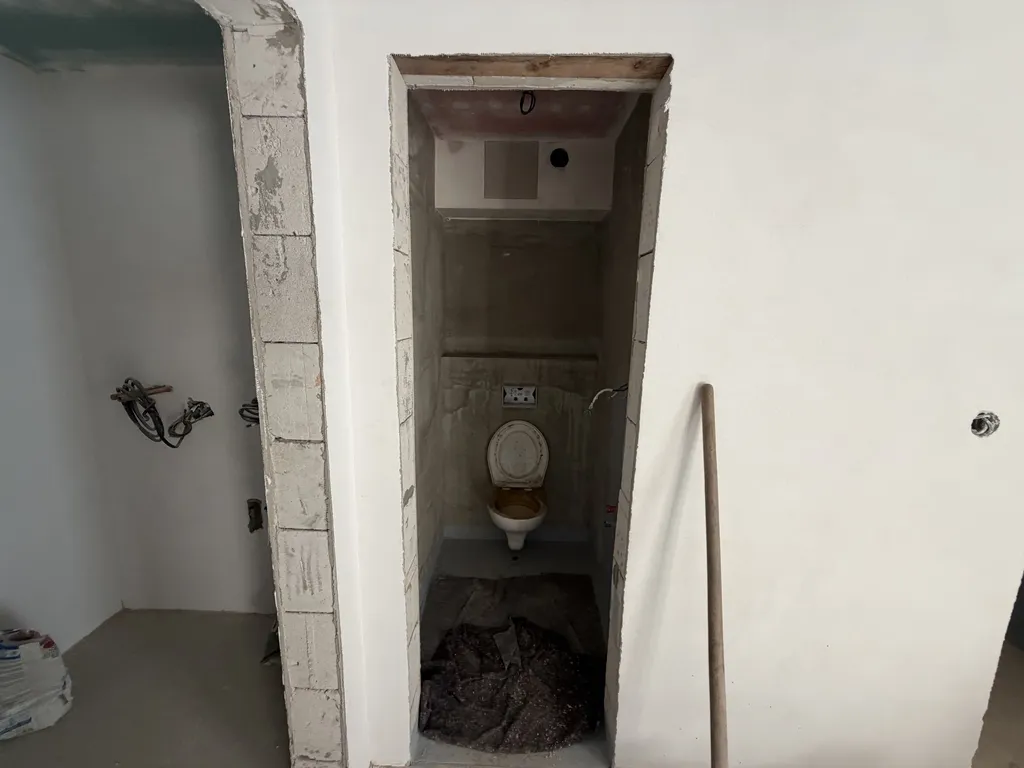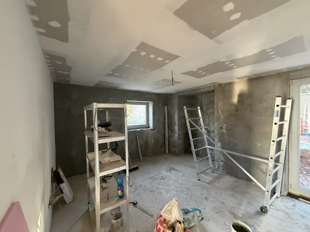 Interiér je aktuálně ve stavu před dokončovacími pracemi, což novému majiteli umožňuje doladit finální povrchy (podlahy, obklady, sanitu, kuchyňskou linku) dle vlastního vkusu. Prostor je připraven na instalaci kuchyně i koupelny, rozvody jsou již vyvedeny.