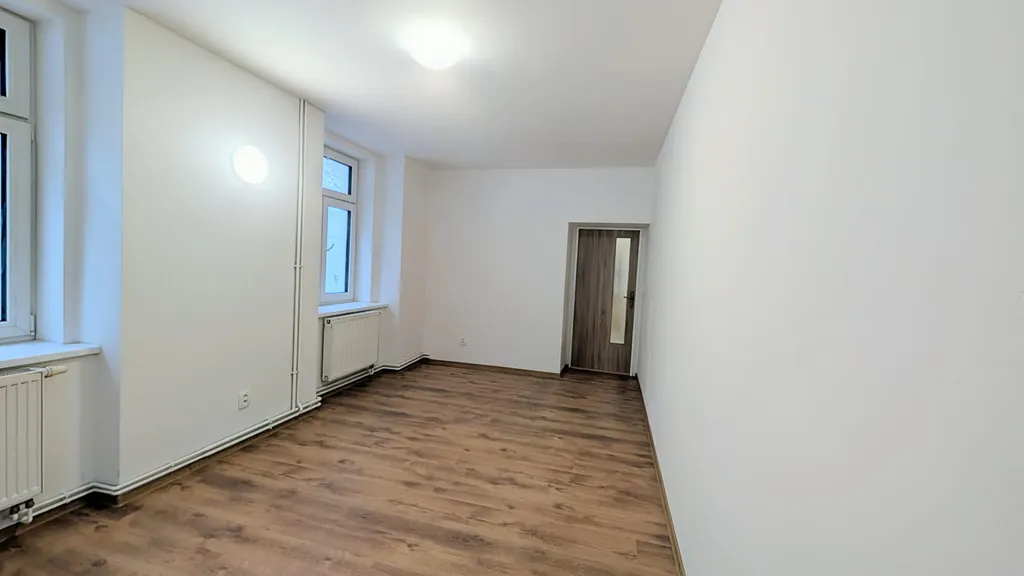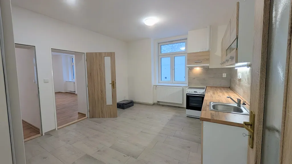 Byt disponuje předsíní, koupelnou se sprchovým koutem a toaletou, kuchyní s obývacím pokojem. Kuchyň je vybavena kuchyňskou linkou vybavenou sklokeramickou varnou deskou, troubou a digestoří. K dispozici jsou dva menší , samostatné pokoje, které lze využít jako ložnici nebo pracovnu.