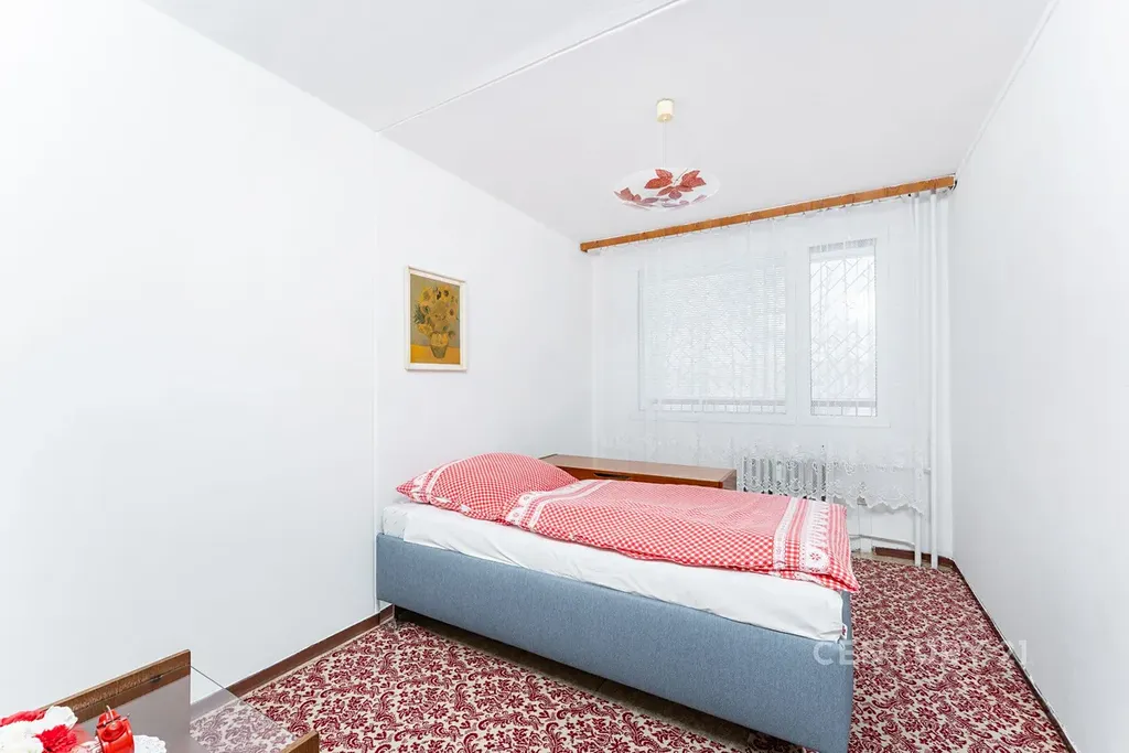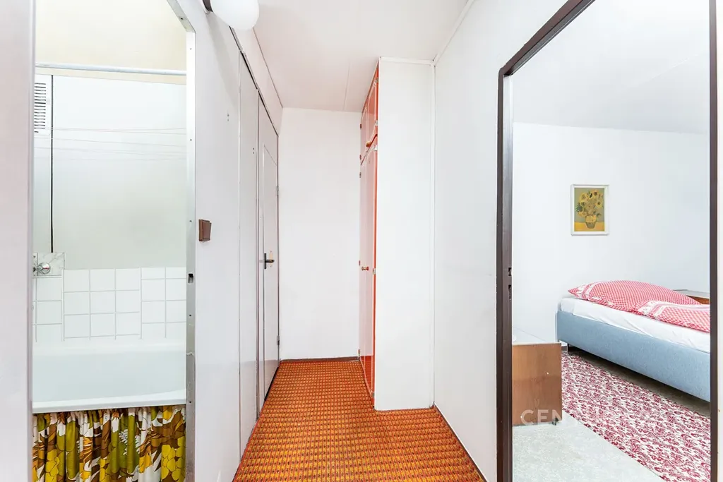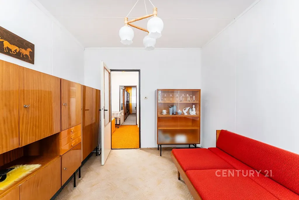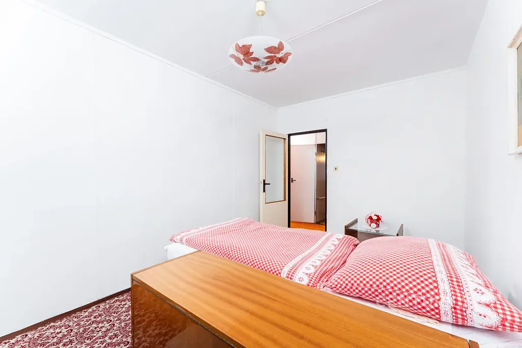 • Dispozice: Obývací pokoj, kuchyně s plynovým sporákem, dvě ložnice, předsíň a původní umakartové jádro (koupelna + samostatné WC).