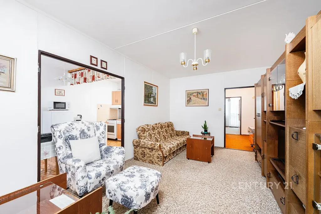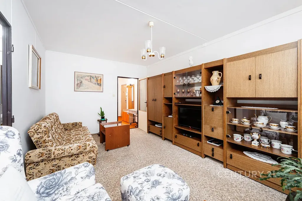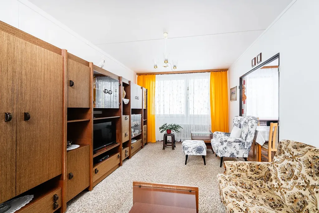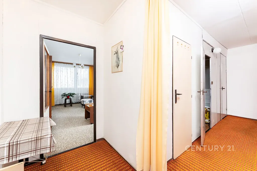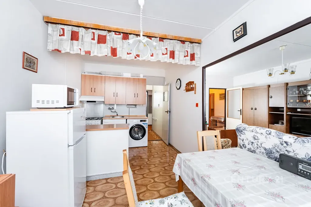 • Dispozice: Obývací pokoj, kuchyně s plynovým sporákem, dvě ložnice, předsíň a původní umakartové jádro (koupelna + samostatné WC).