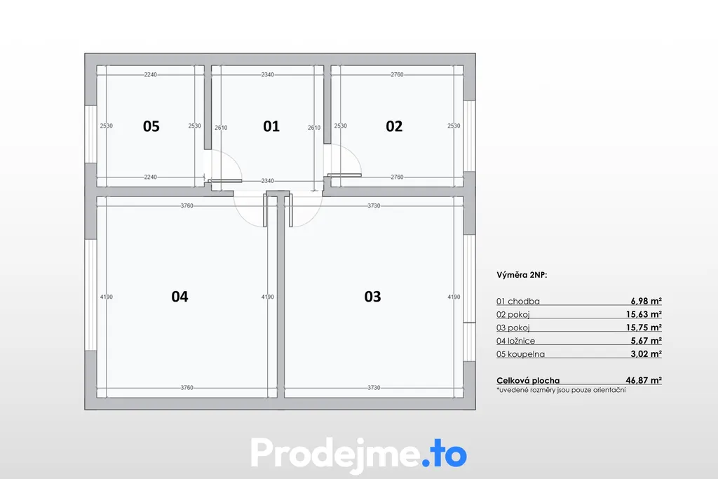 V patře je klidová část domu, která zahrnuje dva větší pokoje, menší ložnici, koupelnu s vanou a toaletou a chodbu se schodištěm. Celková plocha patra činí bezmála 47 m2, což poskytuje dostatek místa pro rodinu i případný pracovní kout.