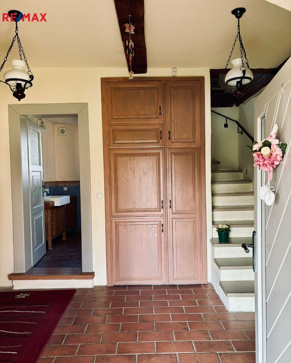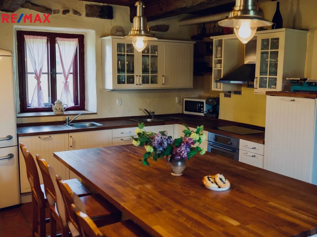 Byt má rozlohu 120 m² a je kompletně vybavený včetně spotřebičů i nábytku. V přízemí se nachází světnice se staročeskou pecí, kuchyňským koutem (elektrická varná deska, dřez, lednice, mrazák) a posezením, dále samostatná plně vybavená kuchyně (indukční deska, horkovzdušná trouba, lednice, mrazák, myčka na nádobí, dřez) s jídelním stolem a koupelna s vanou. V chodbě je možnost připojit pračku a sušičku ve vestavěných skříních. V patře jsou tři samostatné ložnice a dvě další koupelny se sprchovým koutem.
