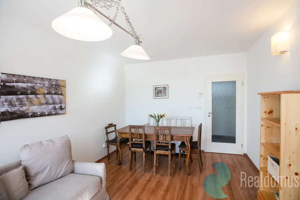 Obývací pokoj s pohovkou a jídelním stolem láká k večernímu posezení s rodinou či přáteli.