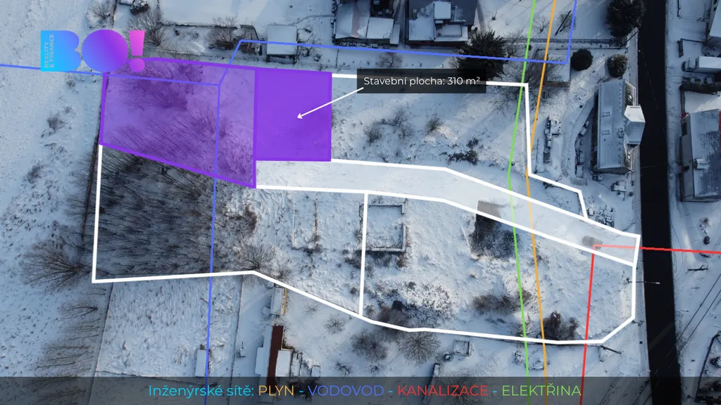 Kompletní inženýrské sítě (elektřina, voda, kanalizace, plyn) se nachází na hranici pozemku.