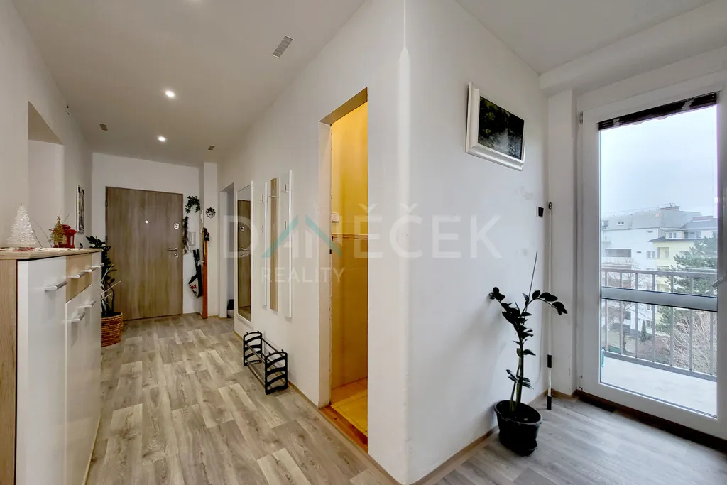 Po vstupu do bytu se otevře prostorná chodba, z níž se dostanete do všech místností. Obývací pokoj vás přivítá světlem a příjemnou atmosférou. O tu se stará cihlový krb v rohu, který dělá z této místnosti srdce celého bytu. Ať už chcete posedět s knihou nebo si vytvořit relaxační atmosféru při práci, tady to půjde samo. Ložnice působí jako klidová zóna – dřevo, světlo, teplé tóny a výhled na město. Je to prostor, kde se snadno vypnete po celém dni. Kuchyň je jednoduchá, praktická a útulná, ideální pro vaření bez chaosu.