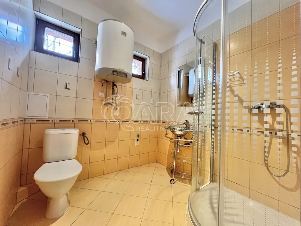 Koupelna: Sprchový kout, toaleta a elektrický bojler pro ohřev vody.