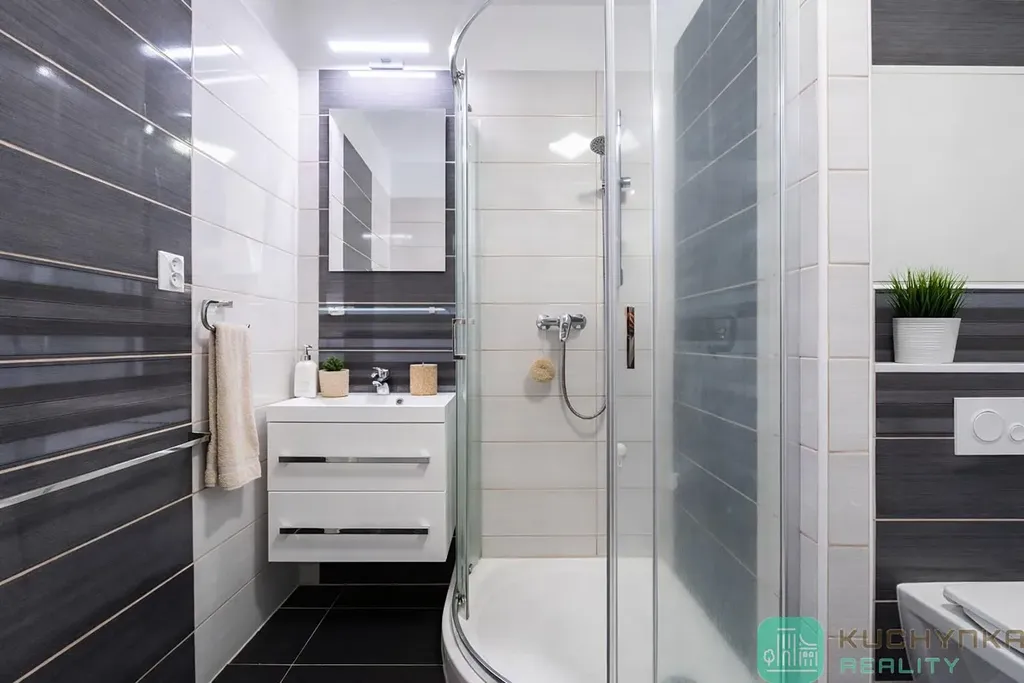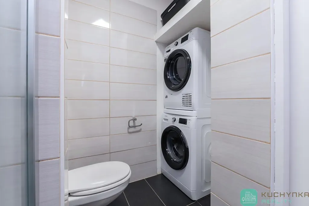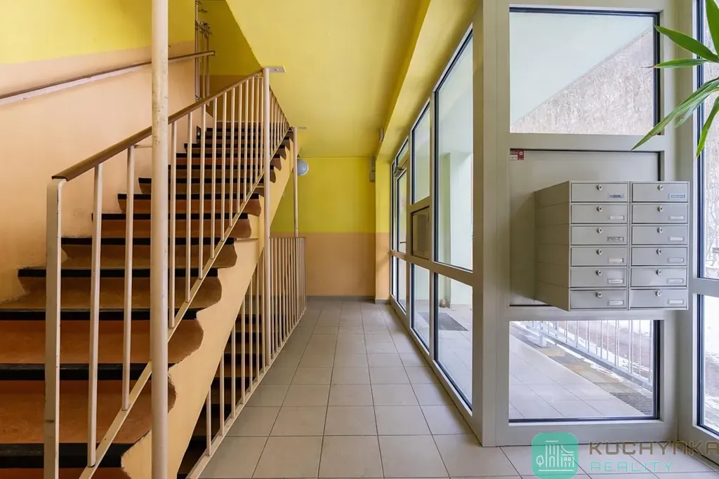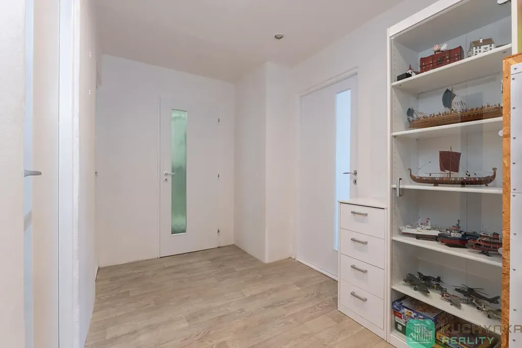 Při vstupu do bytu vás uvítá prostorná chodba se sníženým stropem a bodovým svícením, zleva dva neprůchozí pokoje a prostorná lodžie. Naproti vstupu vkusná zděná koupelna se sprchovým koutem, závěsnou toaletou a šikovným prostorem na pračku se sušičkou. A vpravo skutečně prostorný obývací pokoj propojený s kuchyní a jídelní částí (30 m2). Ve všech místnostech je položeno lino (chybí pouze lišty), moderní interiérové dveře, elektřina v mědi. Kuchyňská linka nepatří k těm nejmodernějším, ale je udržovaná a funkční.