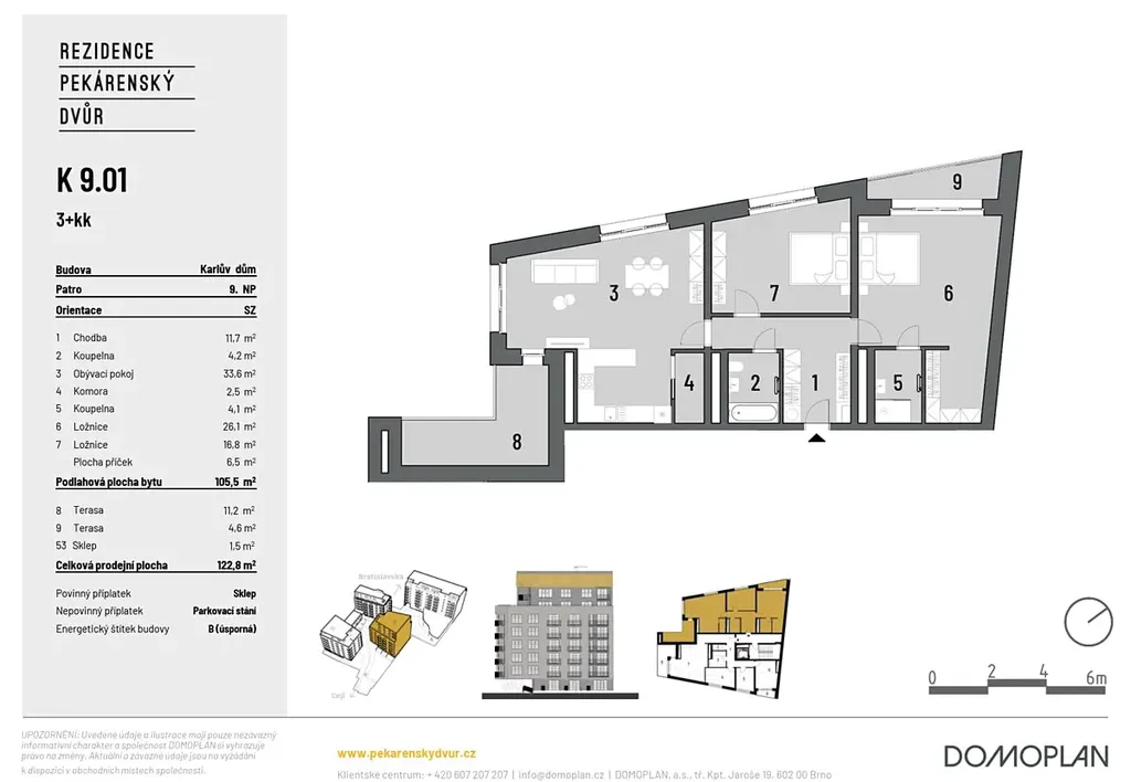 Nabízíme k prodeji moderně navrženou jednotku 3+kk o celkové ploše 105,5 m2 s terasami o velikosti 11,2 m2, 4,6 m2 a 3 m2. Dispozičně jsou jednotky řešeny obývacím pokojem s kuchyňským koutem, dvěma samostatnými ložnicemi, technickou místností nebo šatnou, sociálním zařízením a předsíní.