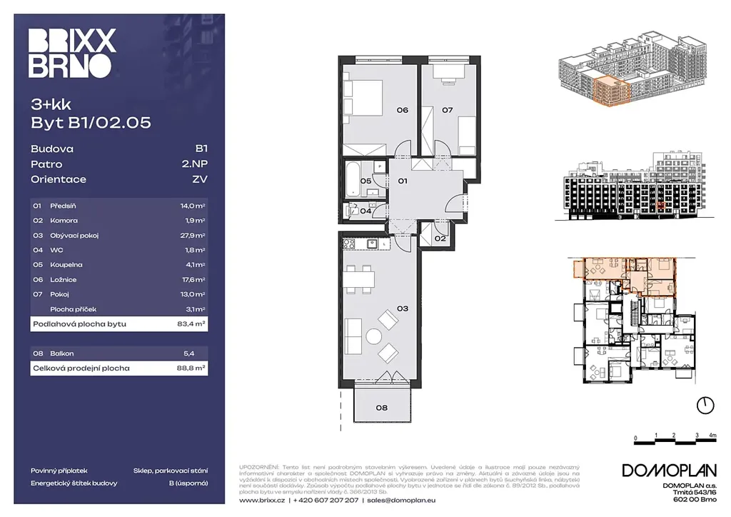 Nabízíme vám ke koupi bytovou jednotku B1/02.05 o dispozici 3+kk s balkonem v rámci nového projektu BRIXX od DOMOPLANu.