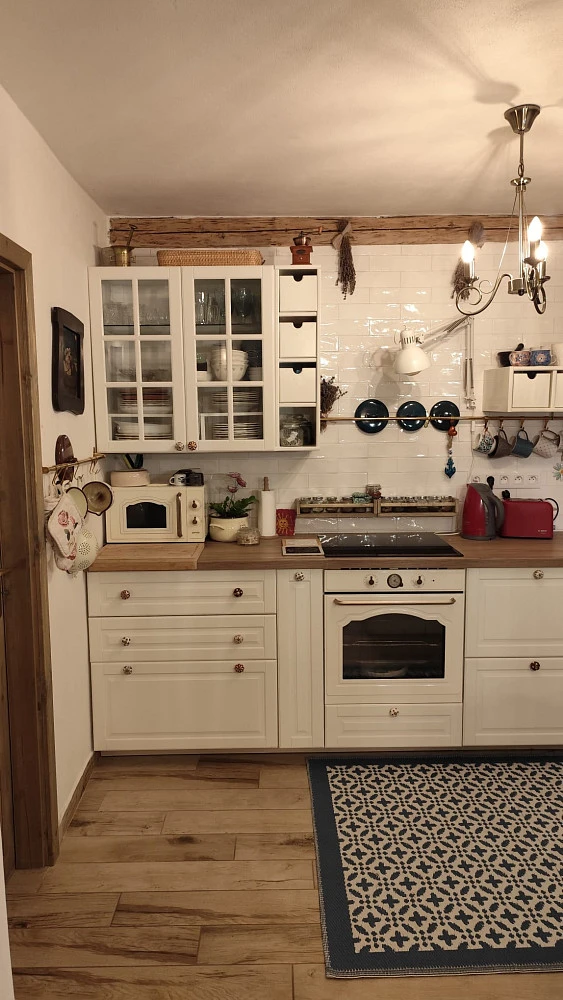 • kuchyňský kout s myčkou, troubou, mikrovlnnou troubou, lednicí, mrazákem, indukční varnou deskou a kompletním nádobím