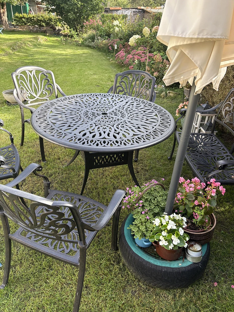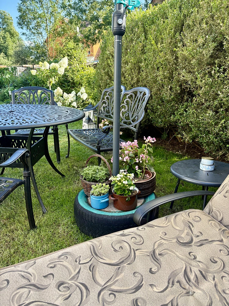 Vstup na soukromou zahradu s posezením a ohništěm.