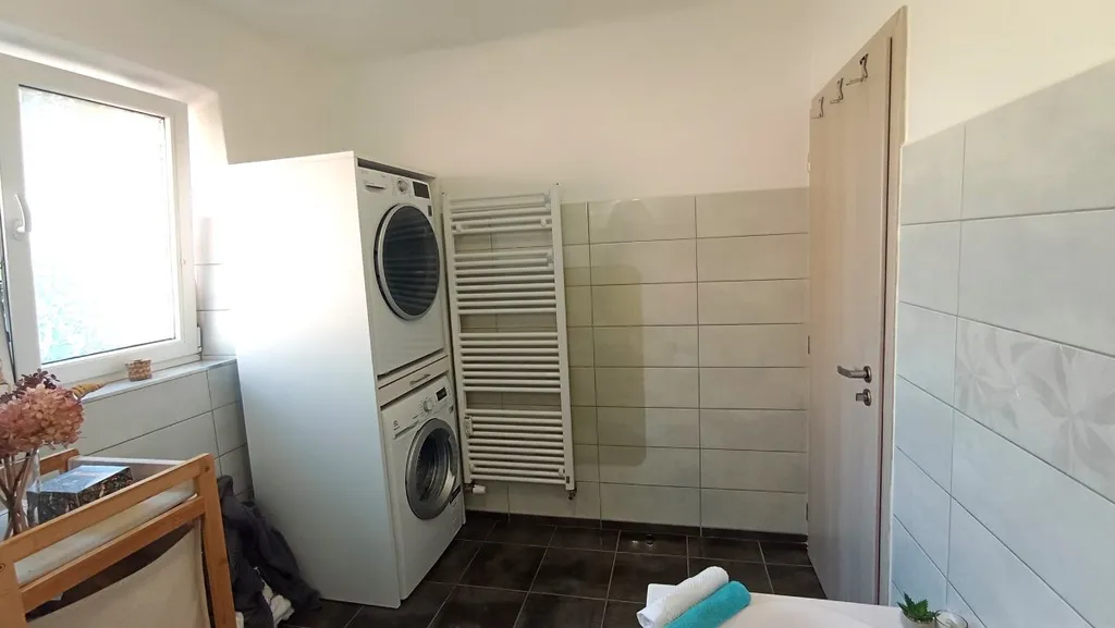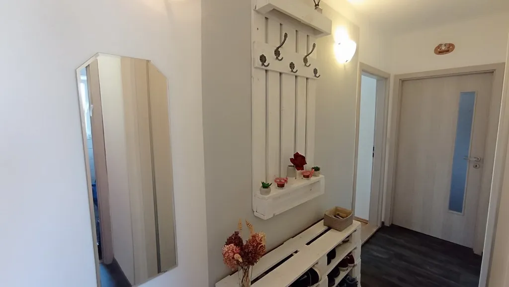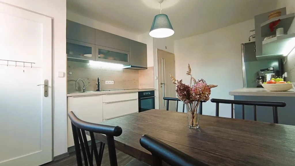 Byt je po rekonstrukci a nabízí se částečně vybavený. Kuchyň je vybavena moderní kuchyňskou linkou s vestavnými spotřebiči - elektrická trouba, sklokeramická varná deska a digestoř. Dále zde nalezneme lednici s mrazákem a jídelní stůl + 4 židle. Součástí kuchyně je prostorný špajz. V obývací pokoji je balkon s výhledem do zahrady za domem. Nábytek vyfocený na fotkách si majitel odveze. Koupelna je vybavena vanou, umyvadlem se skříňkou, otopným žebříkem a je zde umístěno i WC. V předsíni se nachází velká vestavěná skříň. K bytu náleží sklep v přízemí domu a parkovací stání na uzamčeném pozemku, kde je také zahrada s posezením a pískoviště pro děti.