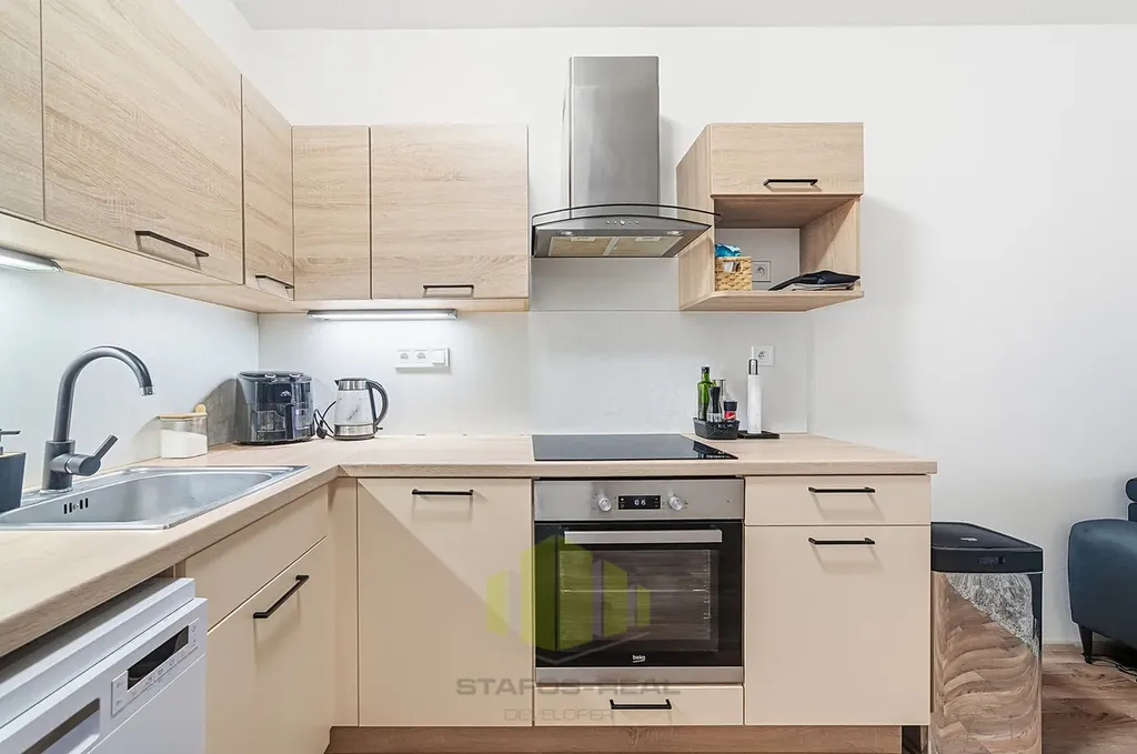 Byt je situován v prvním nadzemním podlaží sedmipodlažní moderní novostavby a je orientován na západ, což zajišťuje dostatek denního světla i příjemnou atmosféru během celého dne. Dominantou bytu je obývací pokoj s kuchyňským koutem řešeným na míru, ze kterého je přes francouzské okno přímý vstup na prostornou lodžii, která nabízí nadstandardní venkovní prostor pro posezení či relaxaci. Součástí bytu je dále samostatná ložnice, koupelna s vanou, umyvadlem, přípravou na pračku a otopným žebříkem, samostatné WC, předsíň a prostorná komora, která je v současnosti využívána jako šatna.