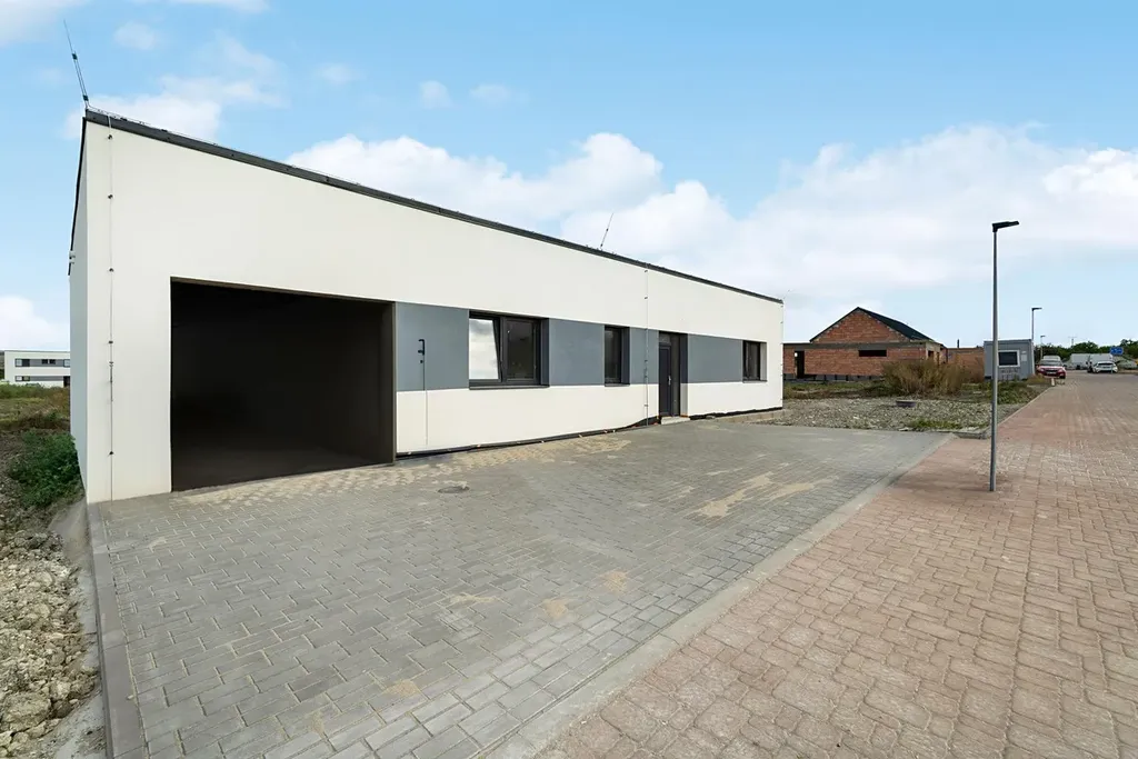 Vytápění domu je zajištěno teplovodním podlahovým topením (systémová deska) s tepelným čerpadlem. Dešťová voda je svedena do retenční nádrže (6 m) s vsakovacím systémem. Prostorná garáž (33 m2) disponuje průchodem na zahradu.