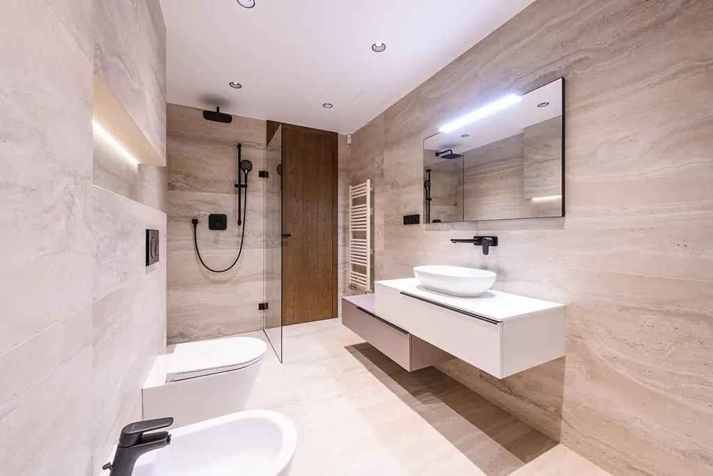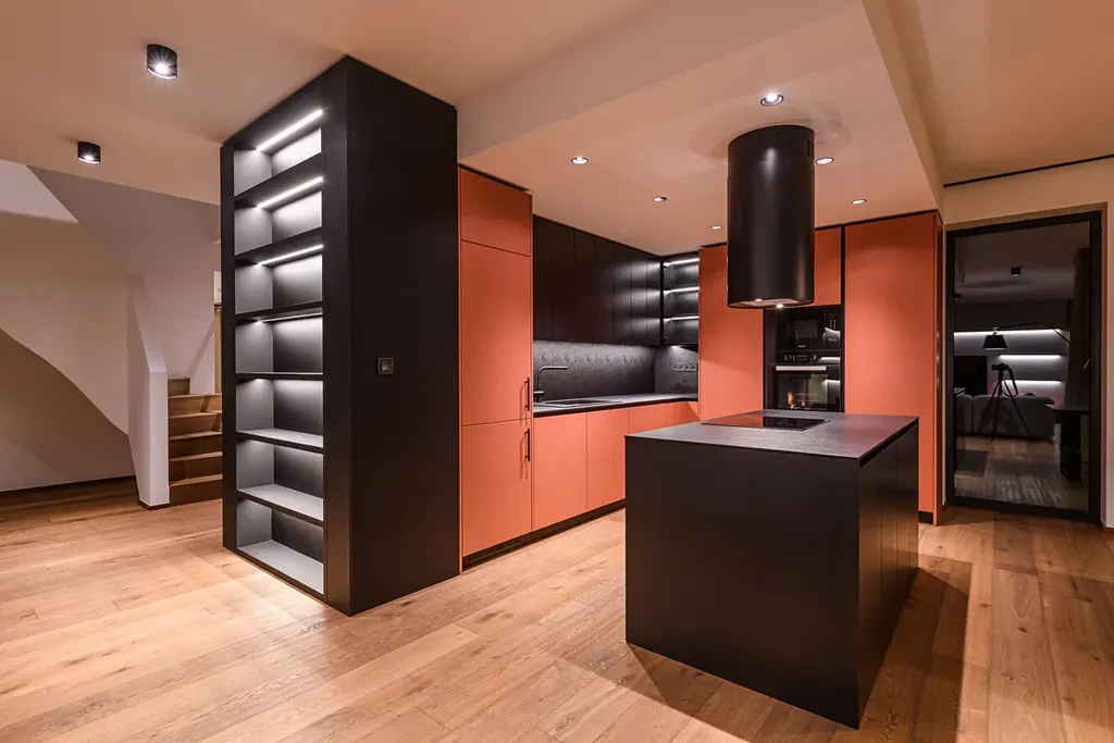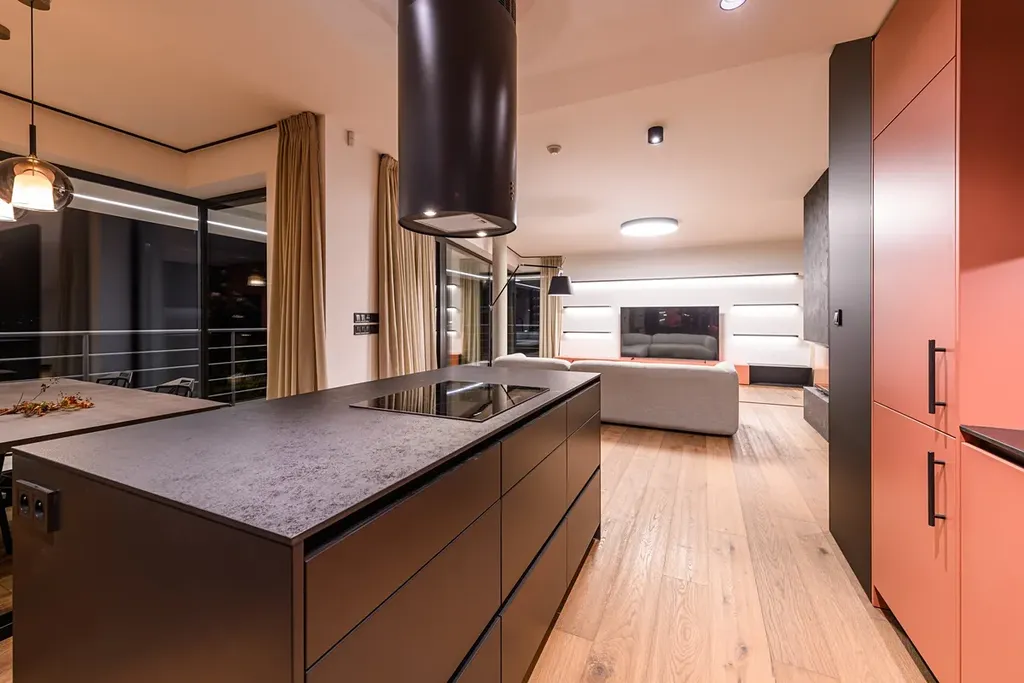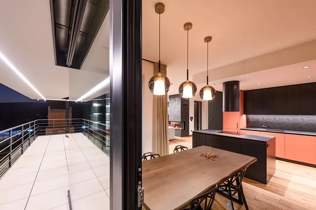 Celou budovu lemují terasy s designovým večerním osvětlením navazující na obytný prostor.