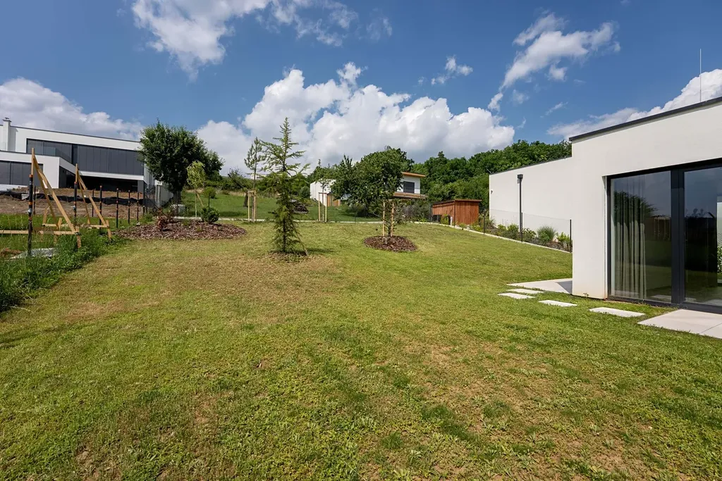 Novostavba vily je citlivě umístěna v mírně svažitém terénu pozemku s překrásnými panoramatickými výhledy do okolní krajiny.
