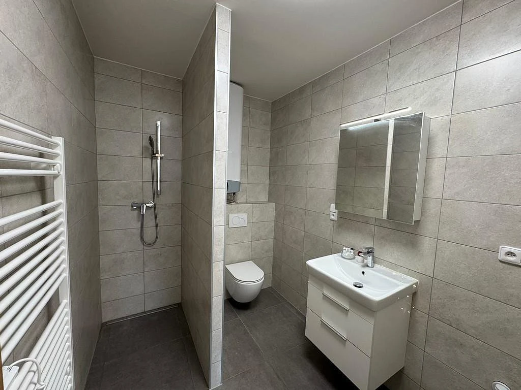 Koupelna s WC: cca 4,18 m, vybavena sprchovým koutem, WC, umyvadlem s umyvadlovou skříňkou a velkým zrcadlem