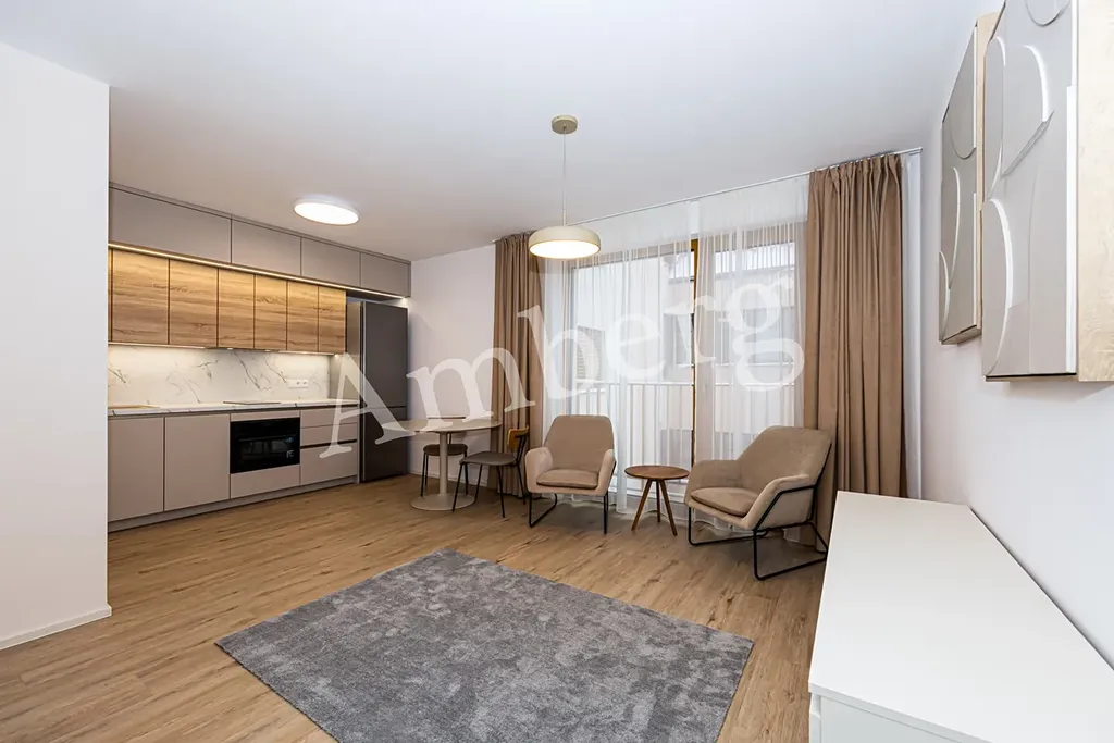 Byt je vkusně zařízen nábytkem na míru, včetně kuchyňské linky s myčkou a indukční varnou deskou, vestavěné skříně s trezorem.