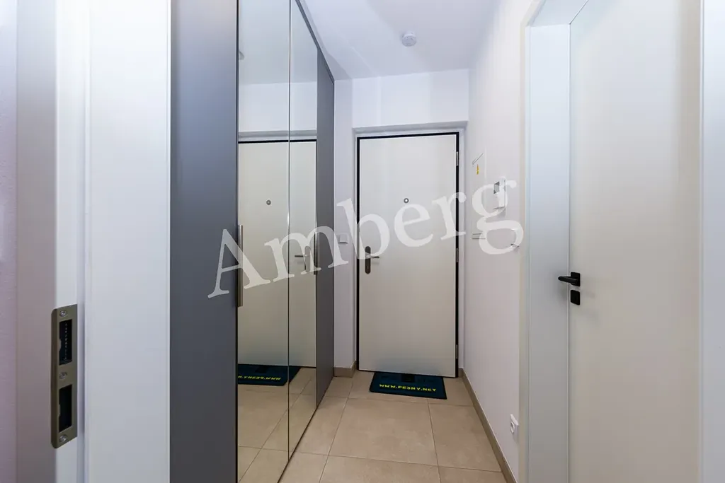 Byt je vkusně zařízen nábytkem na míru, včetně kuchyňské linky s myčkou a indukční varnou deskou, vestavěné skříně s trezorem.