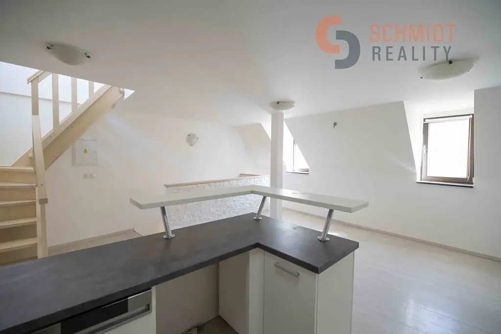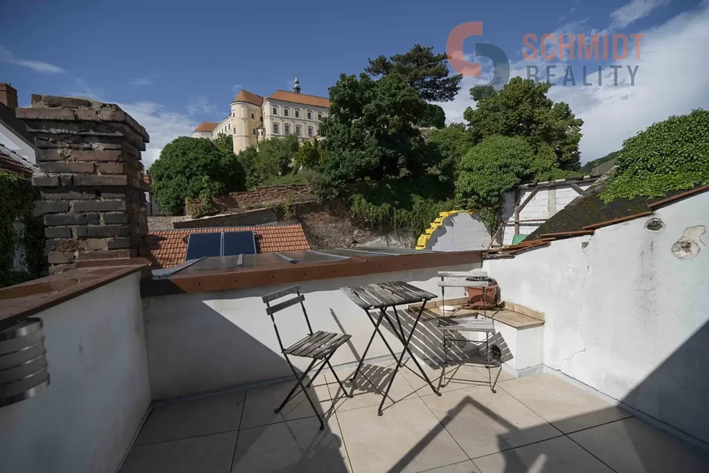 Nabízíme pronájem mezonetového bytu 2+kk v centru Mikulova. Celková výměra vč. terasy činí 86 m2. Jedná se o menší byt s mezonetem situovaný v patře rodinného domu. Patro je složeno z obývacího pokoje s kuchyňským koutem, jedné ložnice a koupelny s WC. V dalším patře je situován mezonetový prostor, který je možné využít jako další ložnici a dále terasa s výhledem na zámek. Ve spodním patře je el. podlahové vytápění. Mezonet je výtápěn el. přímotopem. Ohřev vody zajišťuje el. bojler. Měsíční náklady na energie činí cca 5.000 Kč/měs., v závislosti na režimu domácnosti. Vratná kauce 30.000 Kč. Parkování možné na ulici před domem s vyznačením pro rezidenty. Roční parkovací poplatek městu činí 600 Kč. Byt není vzhledem ke své členitosti vhodný pro nájemníky s malými dětmi. Více informací u makléře. Exklusivně nabízí Schmidt Reality Mikulov.
