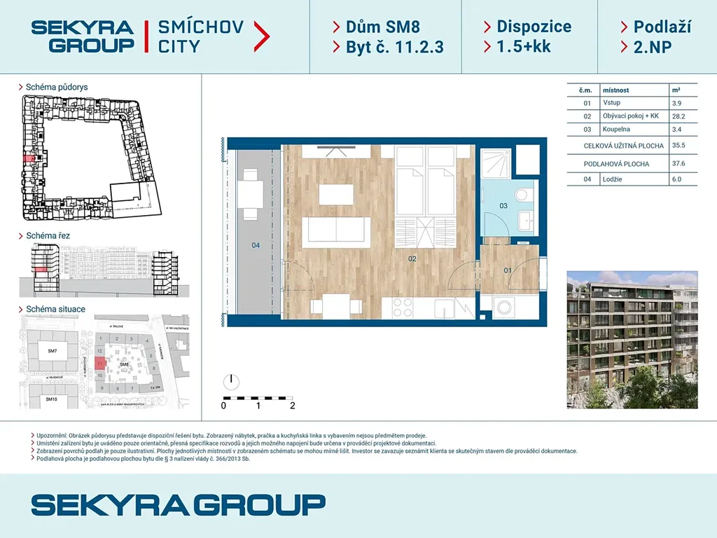 Dovolujeme si Vám nabídnout k prodeji byt 1,5+kk o výměře 37,6 m² s balkónem 6 m², v rezidenčním projektu Smíchov City, blok SM8.