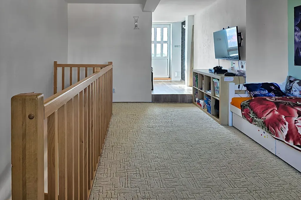 Z obývacího pokoje pak po dřevěných schodech vystoupáte do druhého podlaží, kde naleznete velkou ložnici s možností rozdělení na 2 pokoje.