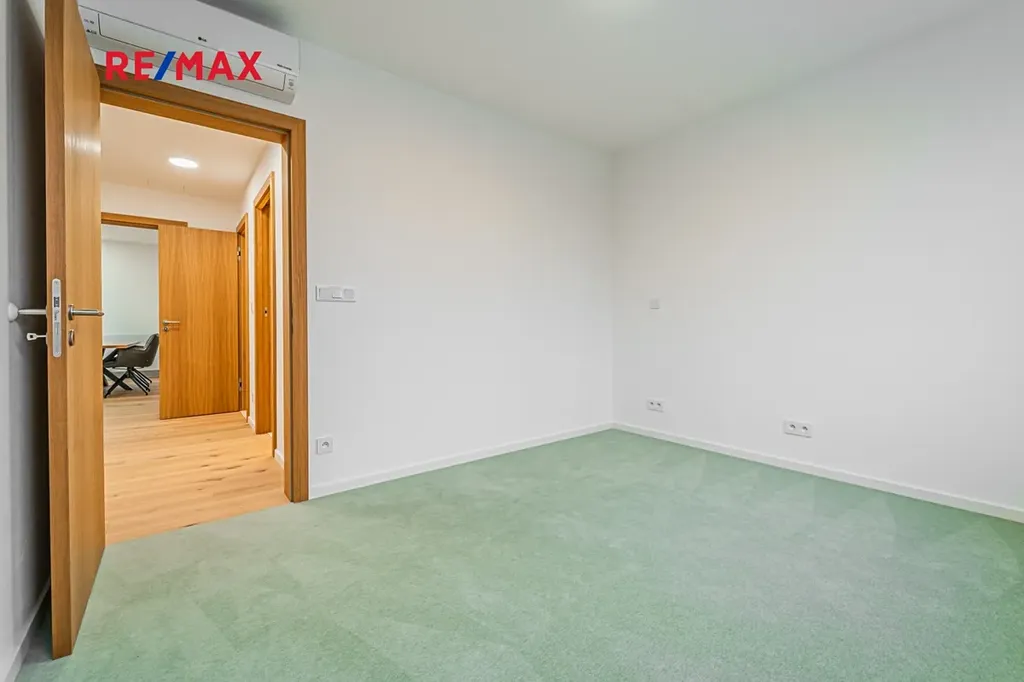 Byt je vybaven novou kuchyňskou linkou na míru včetně spotřebičů Bosch, klimatizací, zabezpečovacím alarmem a vestavěnými skříněmi. Součástí pronájmu je sklepní kóje a jedno venkovní parkovací stání. V domě je k dispozici společná místnost s pračkou a sušičkou.