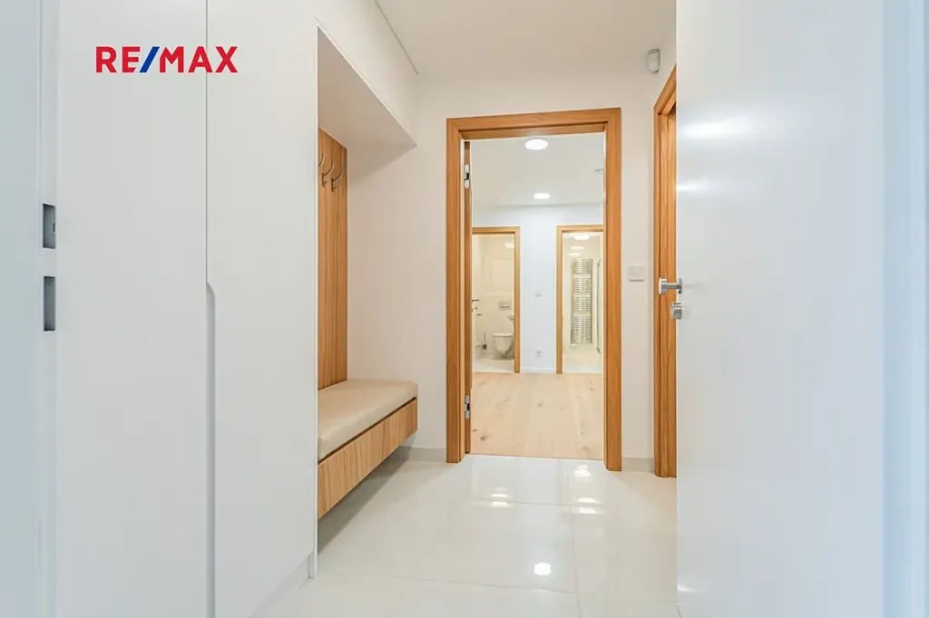 Byt je vybaven novou kuchyňskou linkou na míru včetně spotřebičů Bosch, klimatizací, zabezpečovacím alarmem a vestavěnými skříněmi. Součástí pronájmu je sklepní kóje a dvě venkovní parkovací stání. V domě je k dispozici společná místnost s pračkou a sušičkou.