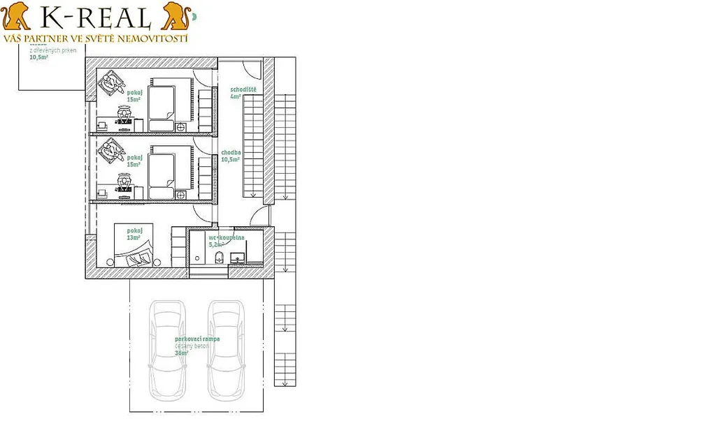 První podlaží je navrženo jako samostatná bytová jednotka 1+kk, kterou lze přizpůsobit vašim požadavkům. Součástí vybavení je podlahové topení s plynovým zdrojem, které zajišťuje komfortní teplo po celý rok. Elektroinstalace je připravena pro dobíjení elektromobilů a instalaci fotovoltaické elektrárny. Exteriér domu nabízí letní terasu ideální pro odpočinek, příruční sklad a dvě parkovací místa