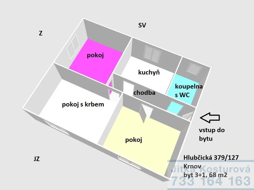 V exkluzivním zastoupení majitele nabízíme na prodej byt o velikosti 3+1. Nachází se ve zvýšeném přízemí cihlového domu na ulici Hlubčická 379/127 v Krnově. Dům se čtyřmi bytovými jednotkami je umístěn v klidné okrajové části města. Výměra bytu je 68 m2, výměra sklepu je 15 m2. Součástí bytu je předsíň, koupelna s umyvadlem, rohovou vanou, WC a přípojkou na pračku, kuchyň, tři samostatné pokoje, sklep a také část půdy. V hlavním pokoji je umístěný zděný krb s vyvložkovaným komínem. Kuchyň disponuje kuchyňskou linkou o stáří cca 12 let, vybavenou plynovým sporákem s elektrickou troubou a digestoří. Okna v bytě jsou plastová dvouskla, o stáří cca 18 let, bez žaluzií. Dveře jsou původní s dřevěnými zárubněmi. V obytných místnostech jsou laminátové podlahy, stáří cca 12 let, v koupelně dlažba. Ve sklepě pod bytem je umístěný plynový kotel pro vytápění, stáří cca 1 rok a bojler na ohřev vody. Rozvody elektřiny jsou v mědi u zásuvek, světla v hliníku. Teplo rozvádí měděné trubky s radiátory o cca stáří 15 let. Byt je určen k rekonstrukci dle vlastních představ. Není zde SVJ, ve fondu oprav je naspořeno cca Třistatisíc Kč. Náklady na bydlení pro 4 člennou rodinu jsou cca do Pěttisíc Kč.