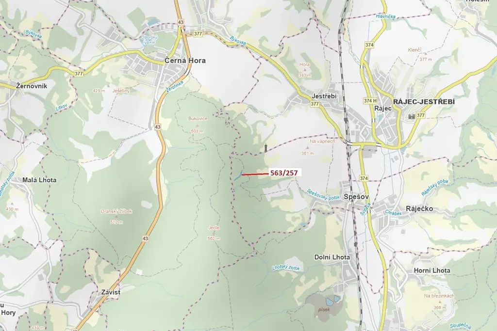 Lesní pozemek o výměře 2643 m2, parcelní číslo 563/257, podíl 1/1, katastrální území Spešov, obec Spešov, obec s rozšířenou působností Blansko, okres Blansko, Jihomoravský kraj.