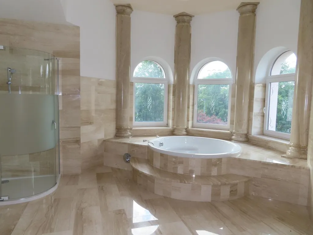 Vila je čtyřpodlažní o celkové užitné ploše 600 m2. Při vstupu vás osloví velká obytná hala s mramorovou podlahou, vysokými stropy, impozantním schodištěm a krásnými nástěnnými malbami. V přízemí se dále nachází příprava na kuch. linku, výstup na terasu a soc. zázemí.