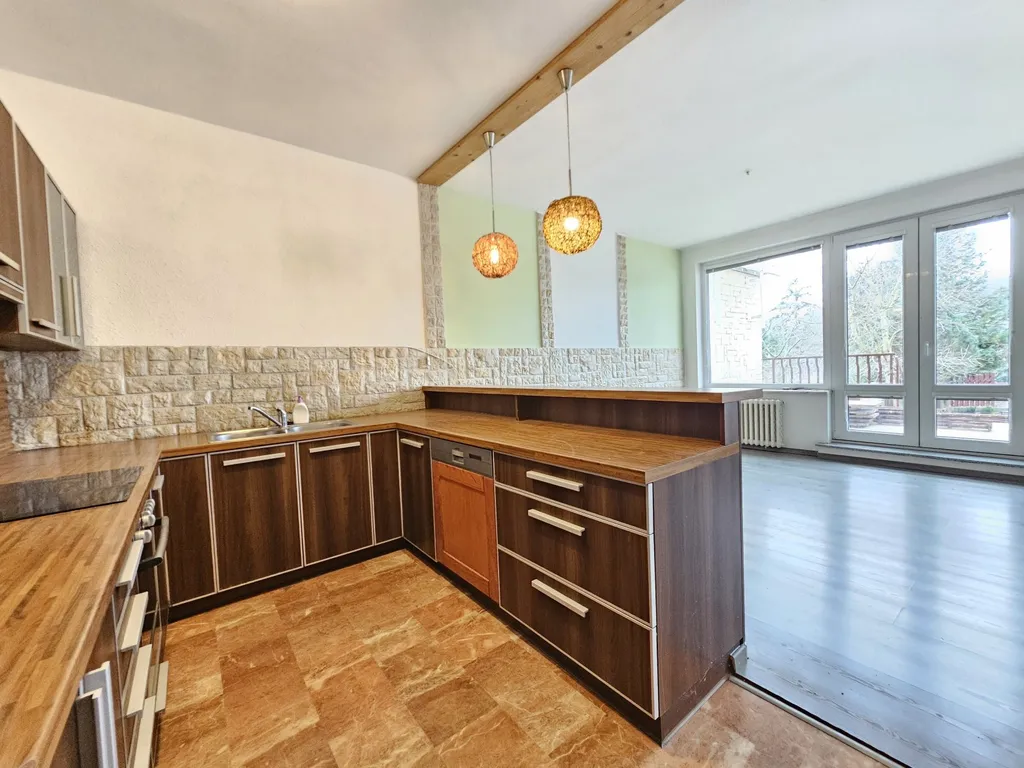 Kuchyně ve tvaru L s jídelnou a obývacím pokojem – ideální pro rodinný život.