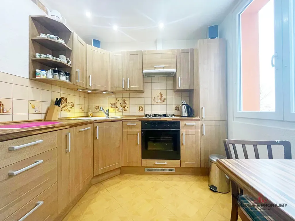 kuchyňská linka je s plynovým sporákem, nová podlaha z dlažby, štuky, plastová okna, orientována J/V.