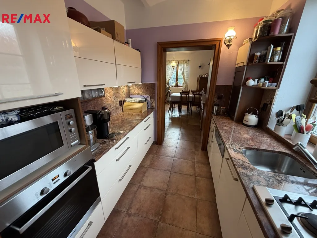Jedná se o prodej rod. domu v obci Vlásenice 4km od Pelhřimova na pozemku o celkové výměře 3.192m2. Multifunkční stavba prošla v roce 2001 generální rekonstrukcí s chytře navrženým využítím spojujícím dvougenerační bydlení (3+1 a 4+1 ) nebo podnikání s bydlením. Dům je dispozičně tvořen v přízemí vstupní předsíní 5m2, halou 34m2, komorou 2m2, chodbou 3,39m2, WC 2,06m2, koupelnu 19,12m2, sušárnou 10,2m2 spíží 3,66m2, kuchyní 5,80m2, obývacím pokojem 27m2, ložnicí 19,12m2 a šatnou 14,62m2. v podkrovní části se nachází 4 pokoje (47,5m2, 14m2, 16,2m2, 31,7m2) dále chodba 31,3m2, kuchyně 9m2, WC 2,16m2, koupelna 9,6m2, komora 3,12 a schodiště 12,5m2. Před domem se nachází dvě krytá stání, v uzavřeném dvoře jež nabízí absolutní soukromí a průjezd do zahrady se nachází stodola využitelná jako garáž. V zahradě je skladový domek 57m2. Vytápění je řešeno novým automatickým kotlem 25KW na pelety nebo dřevo s akumulační nádrží 1000l, druhým zdrojem je plynový kotel napojený na vlastní podzemní nádrž Propan-Butan. Veškeré ovládání topení je přes telefon. Dům je napojen na obecní vodovod, odkanalizování je svedeno do septiku s přepadem. Elektřina 230/400V, napojení na telefonní linku, TV, WIFI, zabezpečení Jablotron s napojením na PCO. Horní i spodní část domu klimatizována. Pro více informací volejte makléře nabídky.